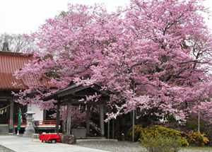 拝殿向かって右手には、中世山城の空堀跡に根を張る桜の古木があります。