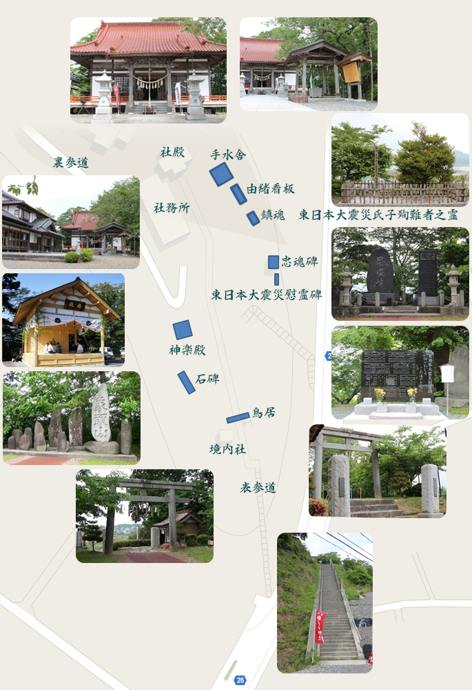 それ以外にも、境内東南の土手にはソメイヨシノが植えられており、桜の季節には、桜越しに気仙沼湾、大島亀山を一望することができます。