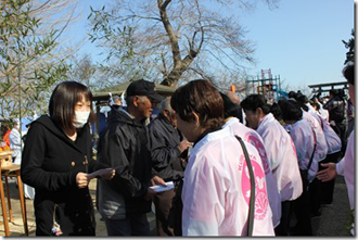 | 人力車に乗って桜がお嫁入り | 熊谷市の皆さんから気仙沼の人たちに一鉢ずつ桜の苗木が 手渡されました。 |